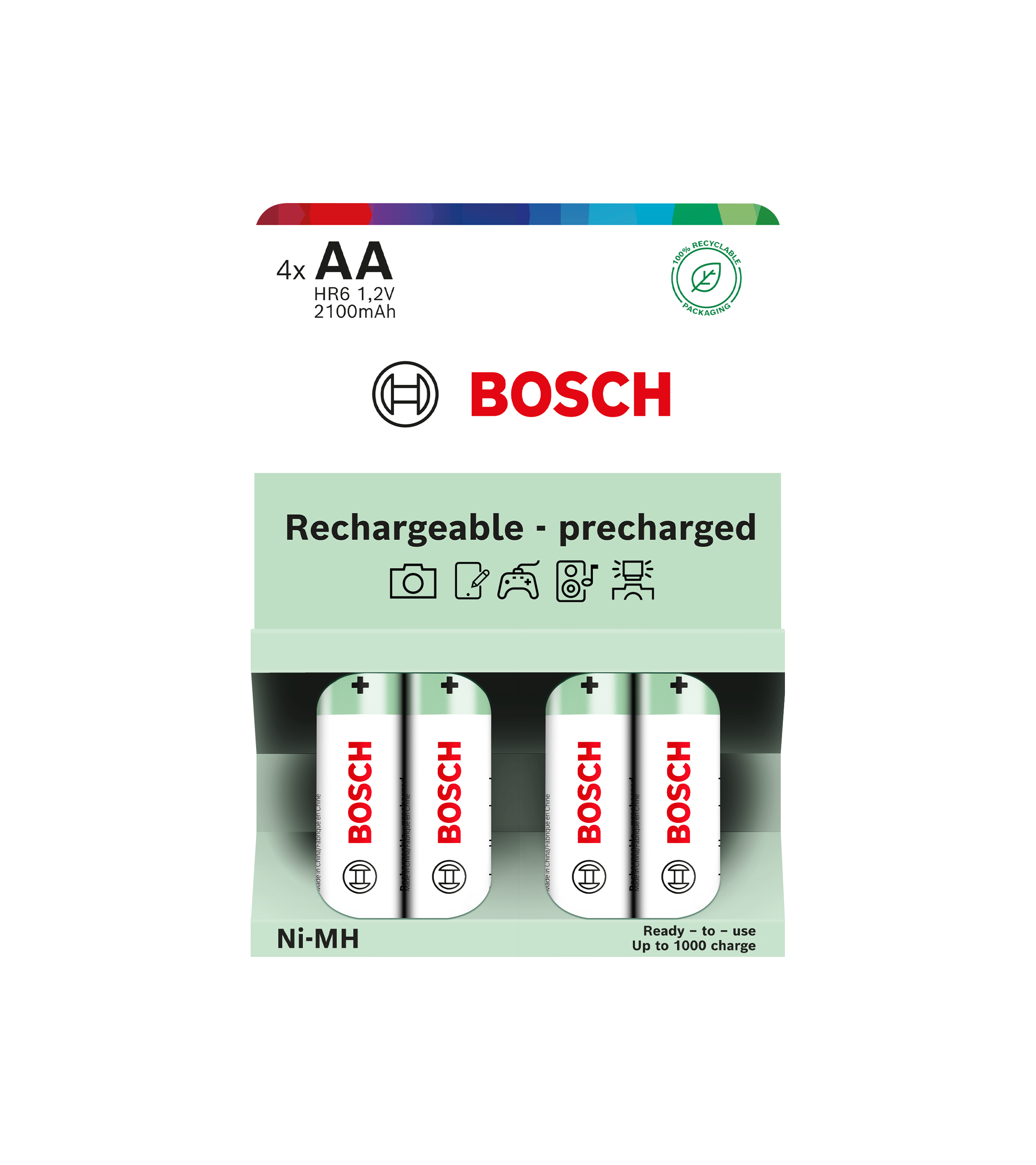 Všechny dobíjecí baterie BOSCH NiMH v balení jsou předem nabité = připravené k použití.